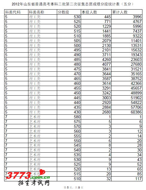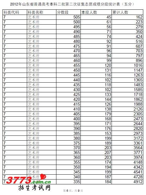 2012年山东高考本科二批第二次征集志愿成绩分段统计表(5分)