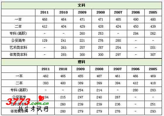 上海2005-2011年高考录取控制分数线一览: