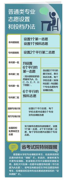 记者从省教育考试院了解到,今年的普通类专业志愿设置和投档办法是这样安排的: