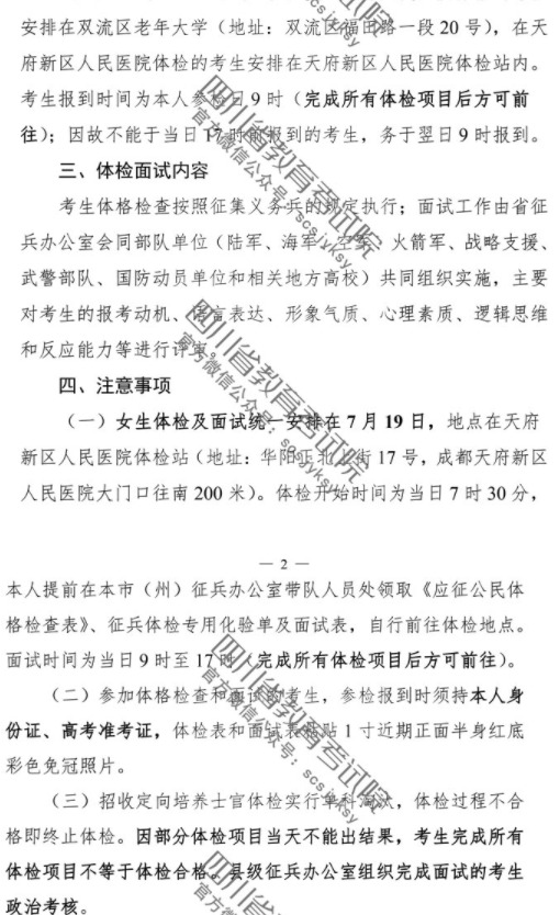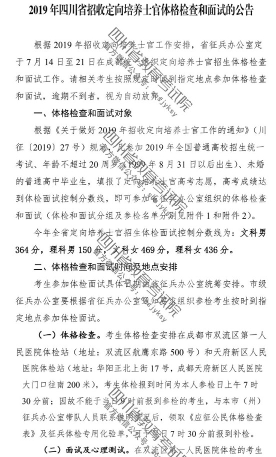 2019年四川省招收定向培养士官体格检查和面试的公告