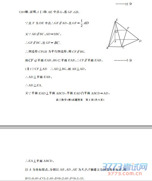 (19)解:证明:(Ⅰ)取AE 中点G,连GF、GB.