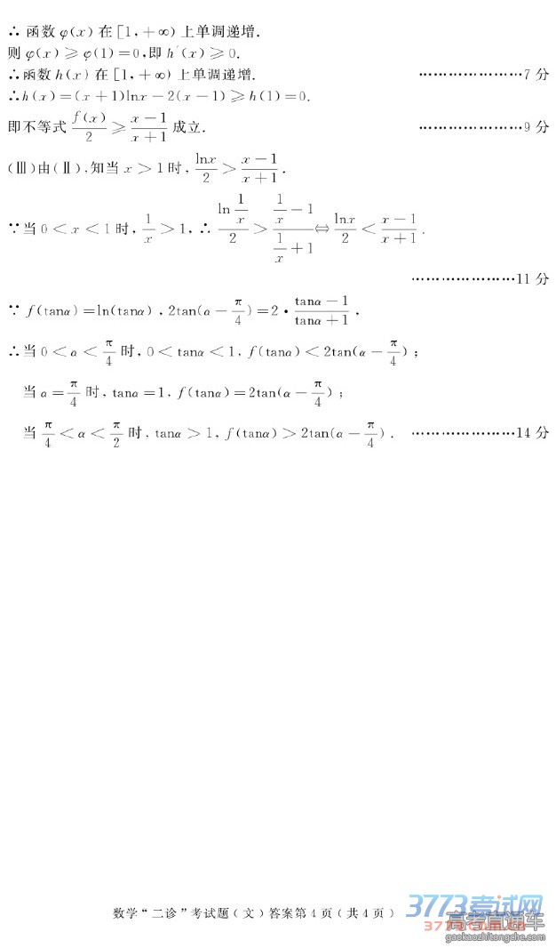2016自贡二诊文科数学答案评分标准免费