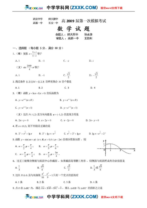 陕西西安市四校09届高三第一次模拟-数学