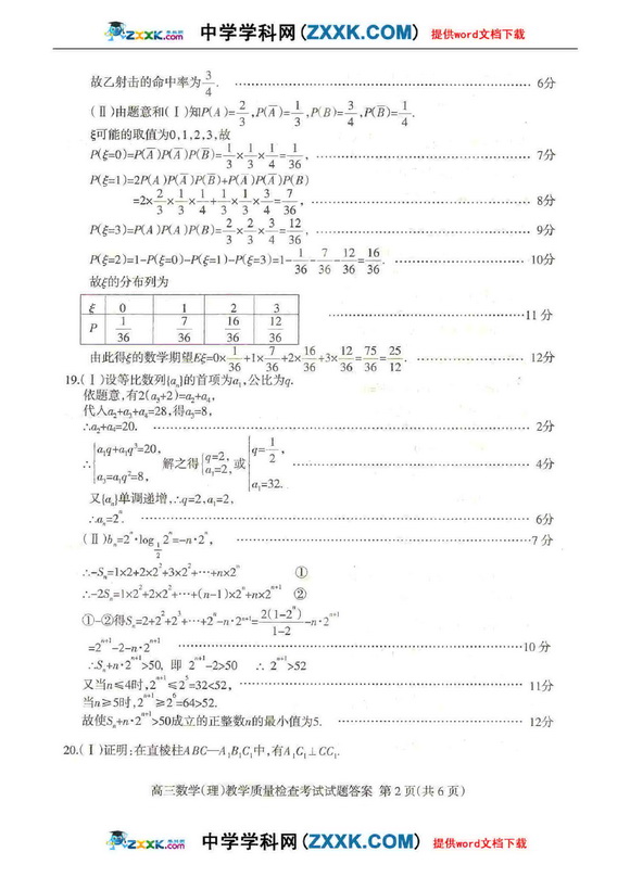 潍坊2011高考二模数学理科试题及答案