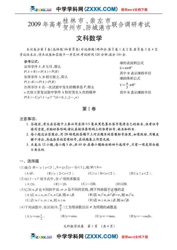 09年高考桂林市等四市联合调研考试数学文