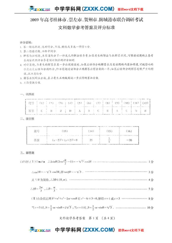 09年高考桂林市等四市联合调研考试数学理
