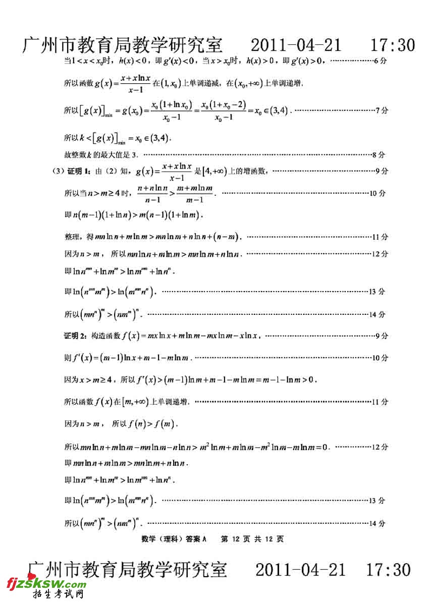 广东广州2011二模数学理科试题及答案