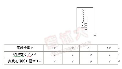 实验:在一个后面附有长度刻度的弹簧上面挂钩码,当钩码的数量增加时,弹簧中的弹力加大,弹簧的伸长增大,把读出的数据记录在表中。