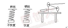 实验:用铁丝弯成一根弹簧,跟用钢丝弯成的弹簧对比。在下面挂较少的钩码时,去掉钩码,两弹簧都能恢复原长。当下面挂的钩码较多时,铁丝制作的弹簧不能恢复原长,而钢丝弯成的弹簧可以恢复原长。可以看出,弹性形变是在一定范围内成立的。