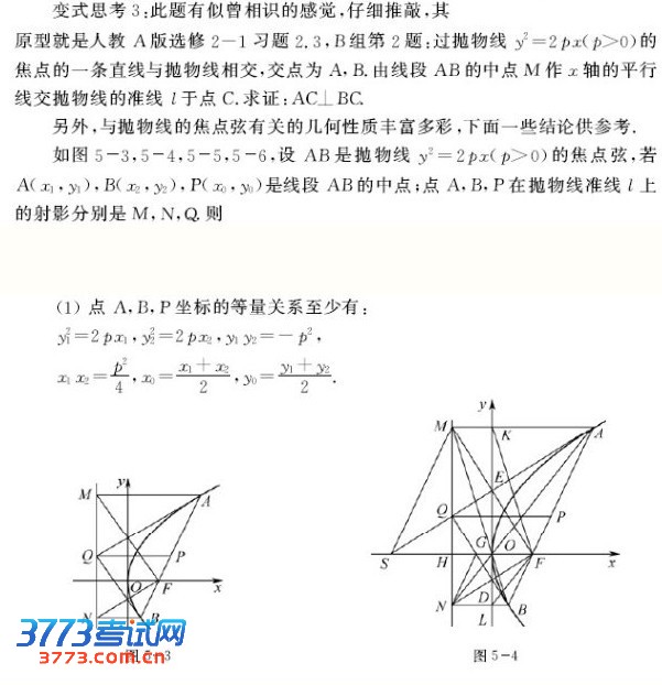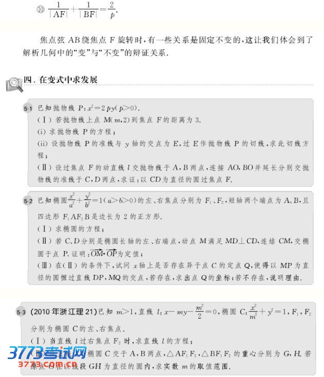 直线与圆锥曲线有无公共点或有几个公共点的问题,可以转化为它们的方程组是否有解或解的个数问题。关于直线与圆锥曲线相交弦问题,则结合韦达定理采用设而不求法。圆锥曲线定义揭示了各自存在的条件、性质及几何特征,若能灵活运用定义法,可避免繁琐的推理与运算。参数思想是辩证思维在数学中的反映,一旦引入参数,用参数来刻画运动变化状态,减少变量,再利用平面几何知识则会化难为易,化繁为简,收到意想不到的解题效果。