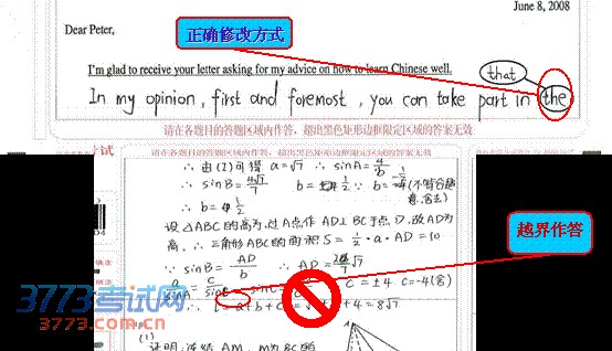 答:高考语文、数学、综合、英语科目均实行网上评卷,各科答题卡样式与市高招办发给考生练习的样卡基本相同,但根据试卷要求,考试时的答题卡会印有相应的题号、答题区域和提示,请考生作答时注意。选择题答案须用2B铅笔填涂,非选择题须用黑色字迹的钢笔或签字笔作答。答题时,考生要在答题卡对应题号指定的区域内答题,不要答错位置或越界作答。如需修改选择题答案,要用橡皮轻擦干净后修改;如需对非选择题答案进行修改,不能用涂改类物品,要用修改符号划去后,紧挨上方或下方写出新的答案,但不能超出该题目的答题区域边框。(填涂示例和各科答题卡基本样式附后)