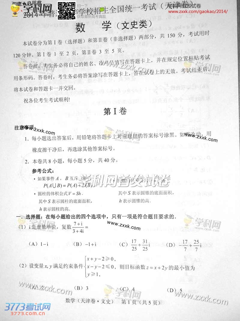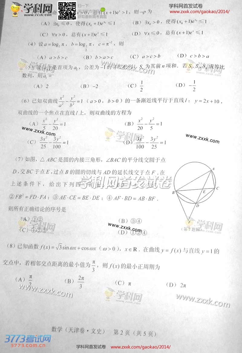 2014天津高考数学文科试题卷发布