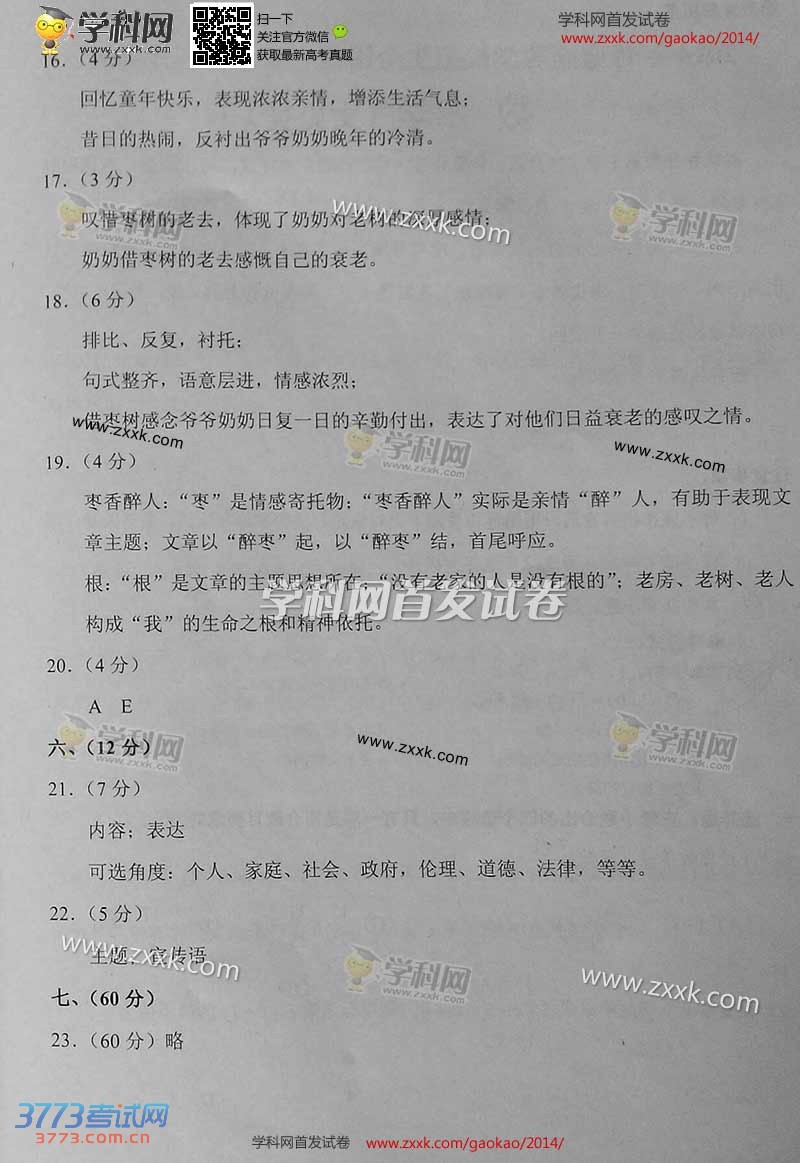 2014天津高考语文答案发布