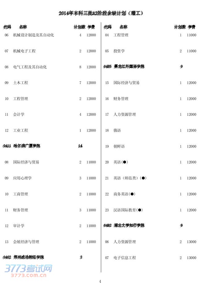 2014天津高考三本A2理科院校余额计划(54所-余缺436)