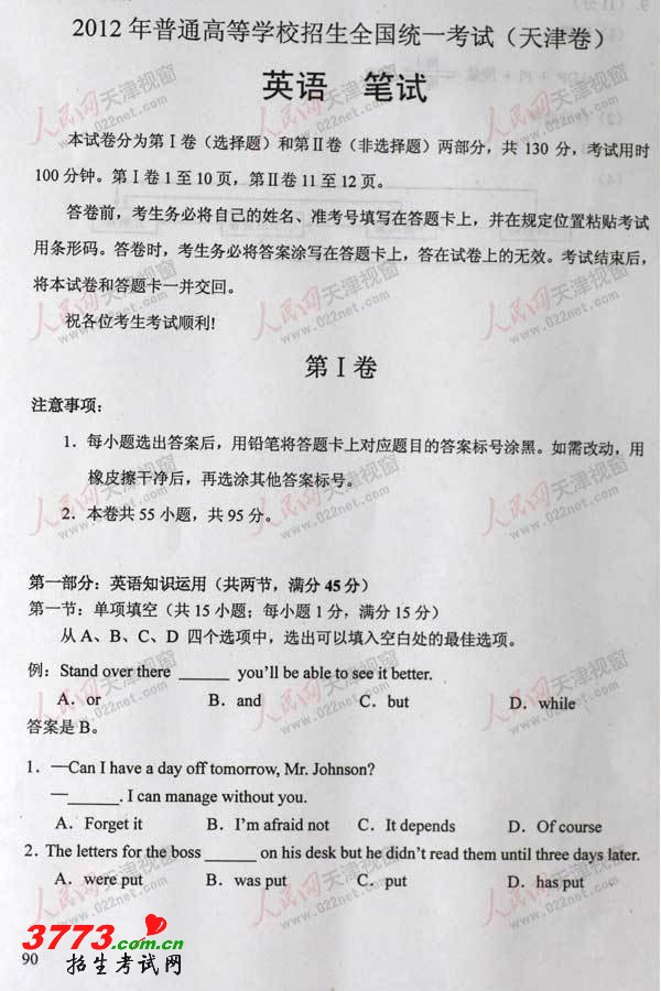 2012年天津高考英语试题及答案发布
