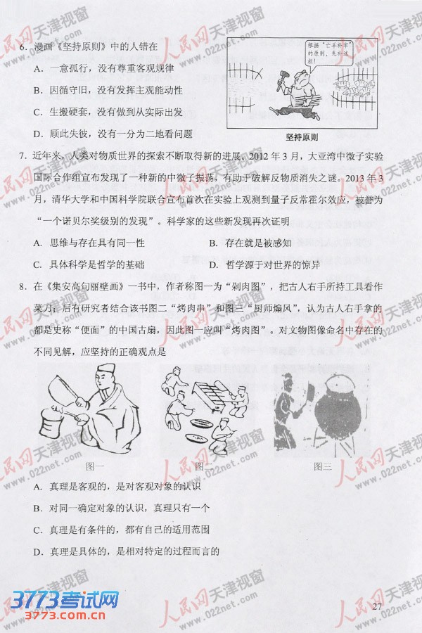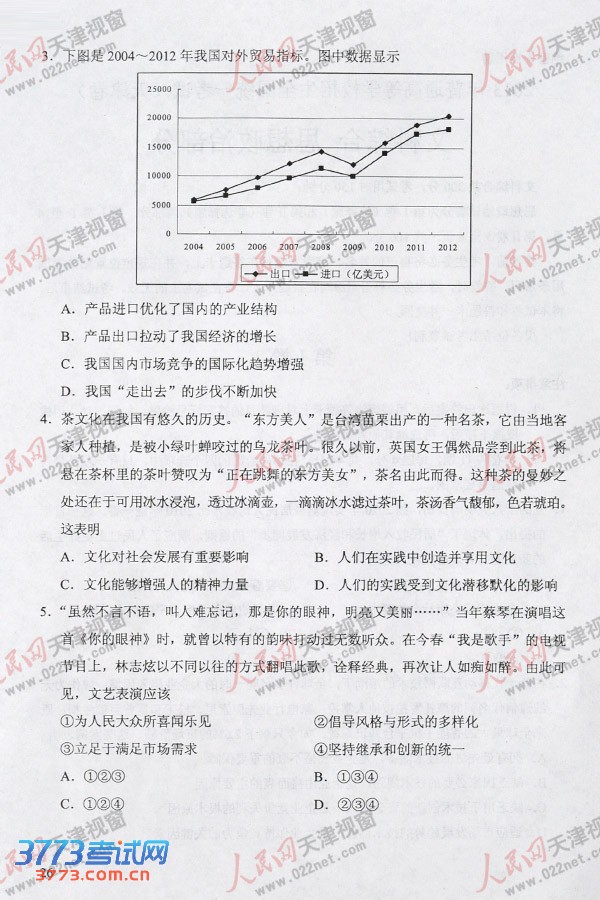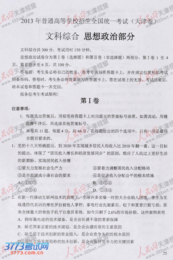 2013高考天津卷文科综合思想政治部分试题第Ⅰ卷