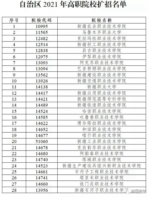 按照《教育部办公厅等六部门关于做好2021年高职扩招专项工作的通知》(教职成厅函〔2021〕9号)和《自治区教育厅等六部门关于做好2021年高职扩招专项工作的通知》(新教厅〔2021〕52号)部署安排,自治区2021年高职扩招报名工作启动。
