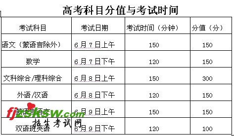 2011年新疆高考考试时间与分值