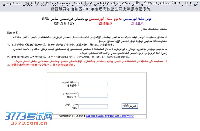 شىنجاڭ ئوقۇغۇچى قوبۇل قىلىش تورى ياكى نوپۇزلۇق ئاخبارات ۋاسىتىلىرىدە ئېلان قىلىنغان ئارزۇ تولدۇرۇش تور ئادرېسىدىن باشقا ھەرقانداق تور بېكىتى ئۆز مەنپەئىتى ئۈچۈن، توردا ئارزۇ تولدۇرۇش بېتىنى ئۇلىۋېلىشى مۇمكىن. ئەگەر ئارزۇ تولدۇرغۇچىلار مۇشۇنداق تور بېكەتلىرىنىڭ ئارزۇ تولدۇرۇش ئادرېسىنى ئاچقاندىن كېيىن مۇناسىۋەتلىك تورغا چىقىش ئۇچۇرلىرىنى كىرگۈزمەسلىكى كېرەك. ئۇنداق بولمايدىكەن ئوقۇغۇچىنىڭ ئۇچۇرلىرىنى ئاشكارىلىۋېتىش خەۋپى كۆرۈلىدۇ. بۇنىڭدىن كېلىپ چىققان ئاقىۋەتكە ئارزۇ تولدۇرغۇچى ئۆزى مەسئۇل.新疆招生网或正规招生媒体公布的普通高校填报志愿网址之外的任何网站出于自身的目的,会加入网报网址的链接。 如果大家在直接点击这些网站的网报网址链接后,不要在其弹出的网报系统登录页面中输入登录信息,否则会有泄露考生信息的危险,由此造成的一切后果由考生本人负责。
