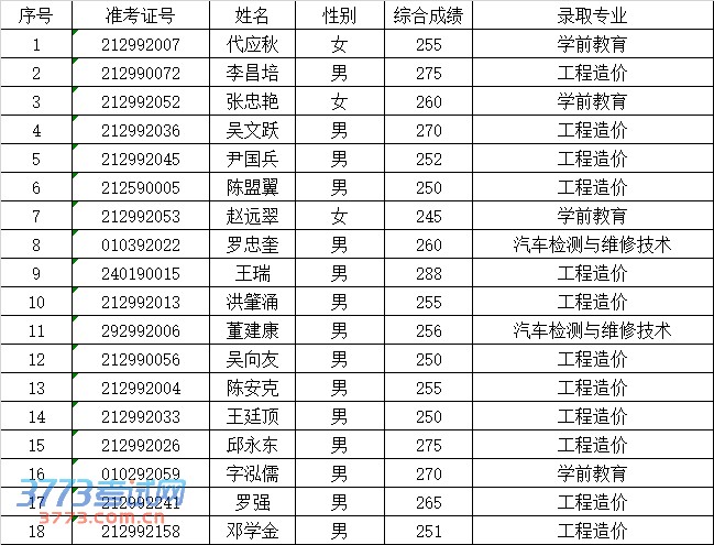 云南工程职业学院2014年高职对口招生预录取公示名单