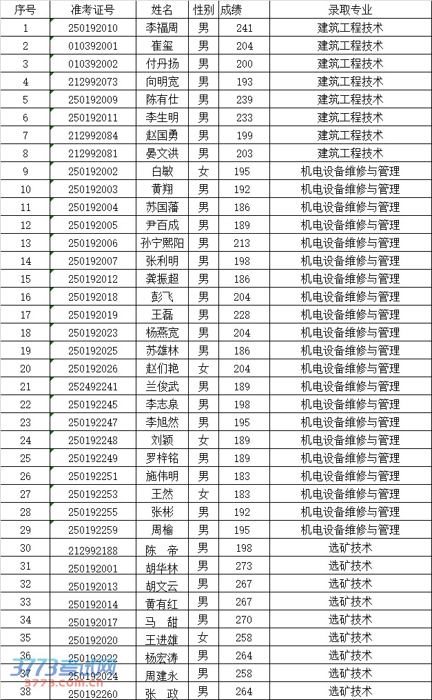 云南锡业职业技术学院2014年高职对口招生拟录取名单