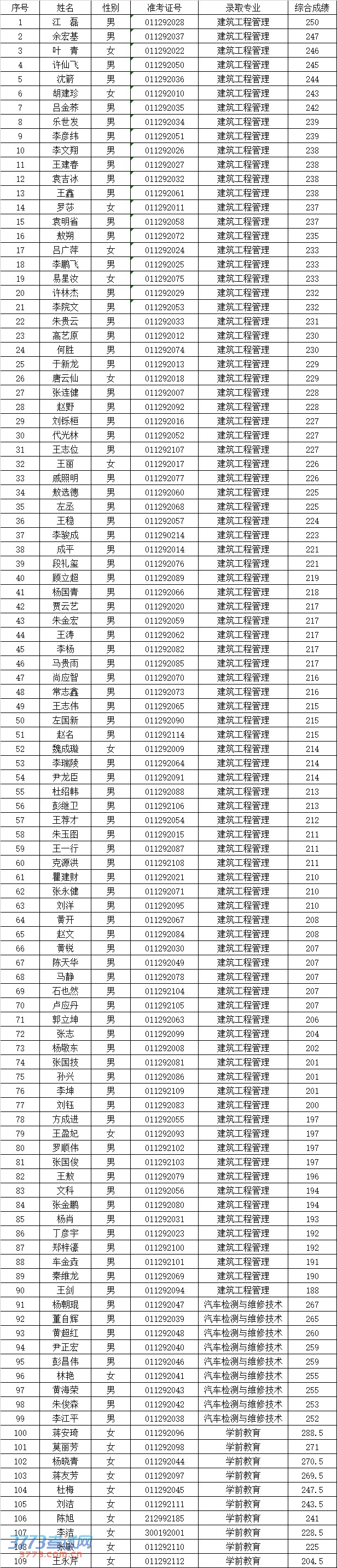 云南旅游职业学院2014年高职对口招生拟录取公示名单