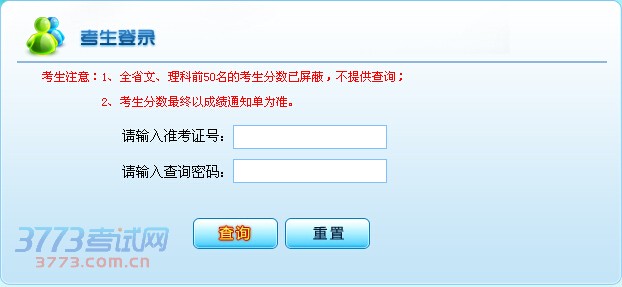 考生注意:1、全省文、理科前50名的考生分数已屏蔽,不提供查询; 2、考生分数最终以成绩通知单为准。 。