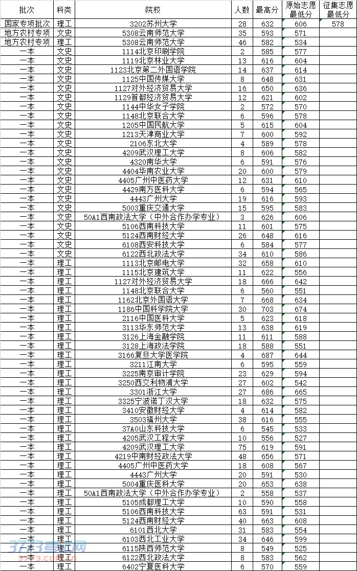 2014云南高招一本投档录取院校分数线公布