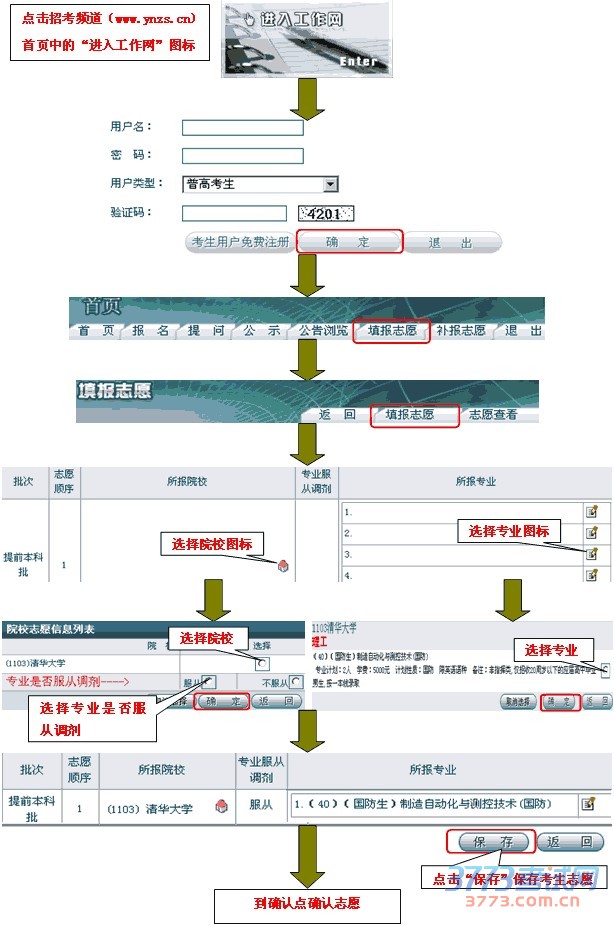 在填报截止时间之前,考生登录工作网(www.ynzs.cn或www.ynzk.cn),自行进行志愿填报;在确认截止时间之前,考生携带准考证到确认点进行确认、签字,完成志愿填报。