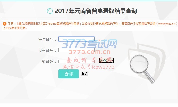 2017年云南省普高录取结果查询注意:1.建议您使用IE8以上或Chrome等浏览器进行查询;2.如收到征集志愿通知的考生,请密切关注云南省招考频道(www.ynzs.cn)上的志愿征集信息。