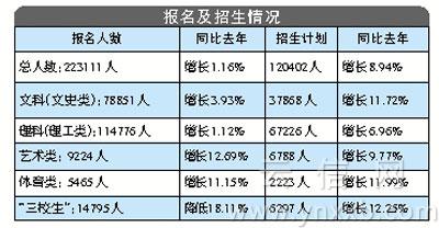 在不少省外高考报名人数都有所下降的情况下,我省高考报名人数仍旧呈现增加态势。去年,我省高考报名人数为220535人,今年则达到223111人,增加了2576人。省招生考试院院长朱华山表示,原来预计今年考生增加在2万人左右,由于教育部统一要求高中非应届毕业生(高一、二年级)学生今年不得参加高考,所以报名人数没有达到预期。此外,我省城乡考生报名人数比例变化较大。今年,城市考生报名人数占总报名人数比例由29.7%下降到26.94%;农村考生报名人数的比例则由70.3%上升到73.06%。
