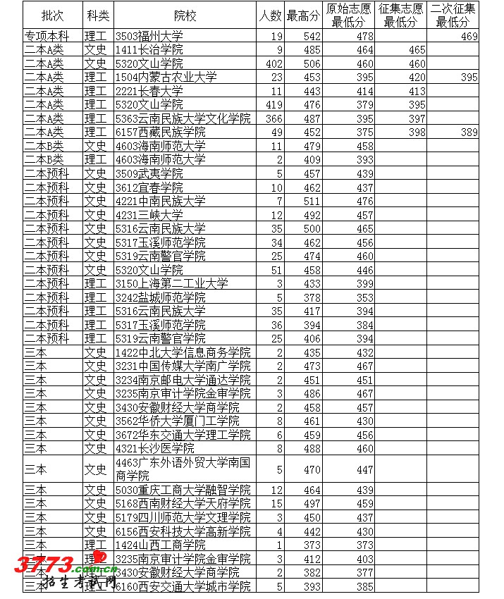 2012年云南专项本科第三次本二A第二次征集志愿招生计划