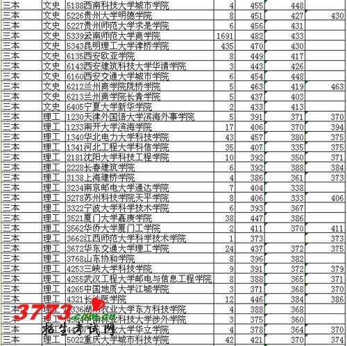 云南网讯 (记者 普日果萱)8月3日,云南省招生考试院继续公布三本院校招生及征集志愿情况。省内院校云南师范大学商学院共录取2367人,其中文科1691人,最低分433分,理科676人,最低分371分;昆明理工大学津桥学院共录取1010人,其中文科435人,最低分430分,理科575人,最低分378分。