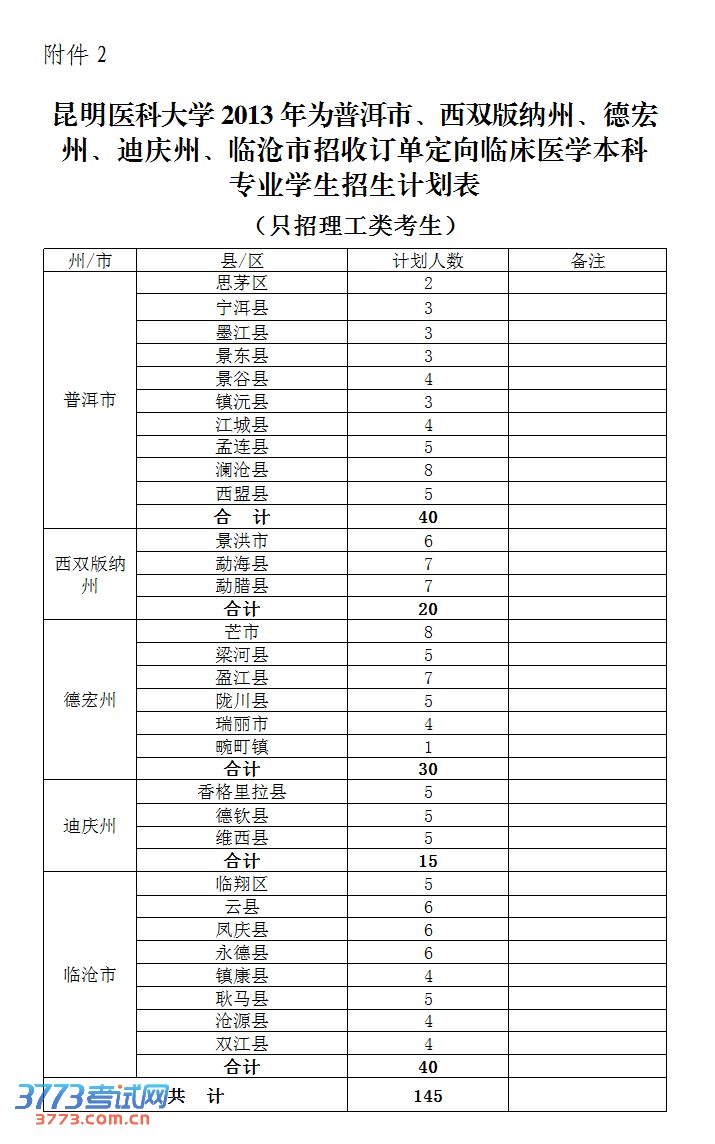 昆明医科大学2013年为临沧市、普洱市、西双版纳州、德宏州、迪庆州培养订单定向临床医学本科专业学生招生计划