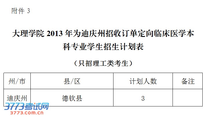 大理学院2013年为迪庆州德钦县培养订单定向临床医学本科专业学生招生计划
