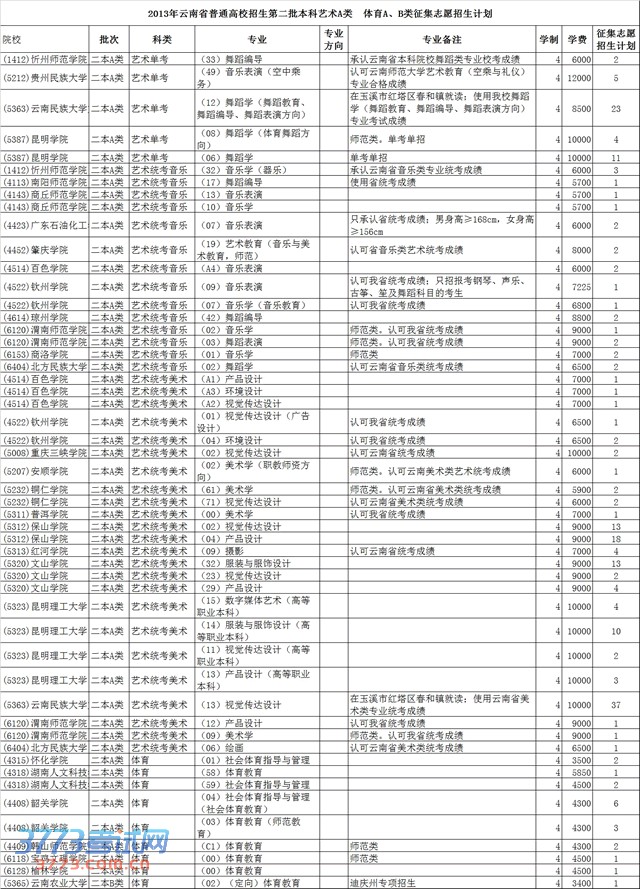 2013云南高考二本艺术A类体育AB类征集志愿招生计划