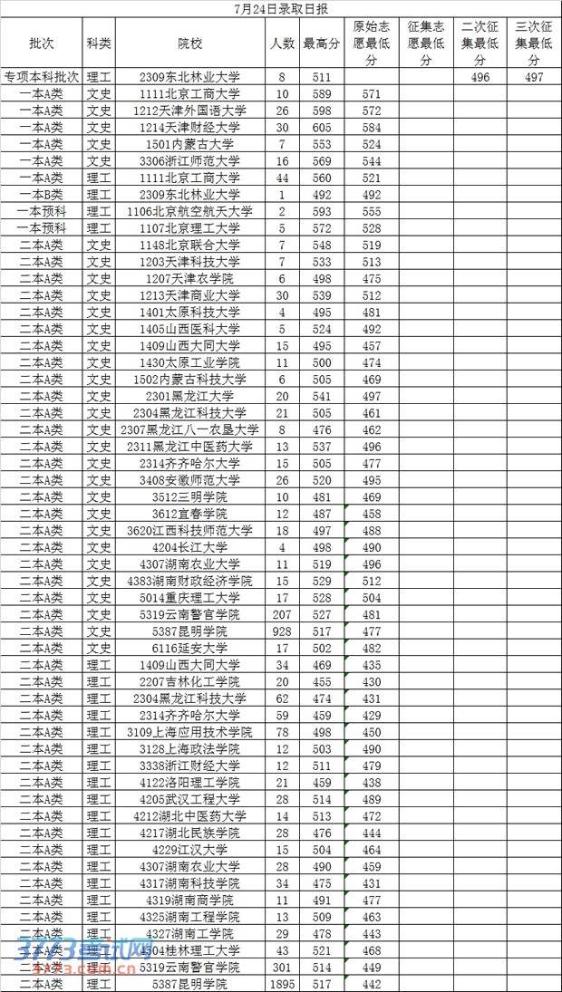 2013年7月24日云南高考录取分数线日报