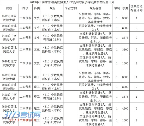 2013年云南省普通高校招生人口较少民族预科征集志愿招生计划