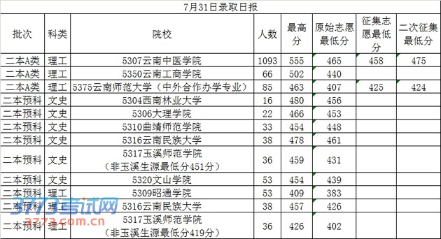 2013年7月31日云南高考录取分数线日报
