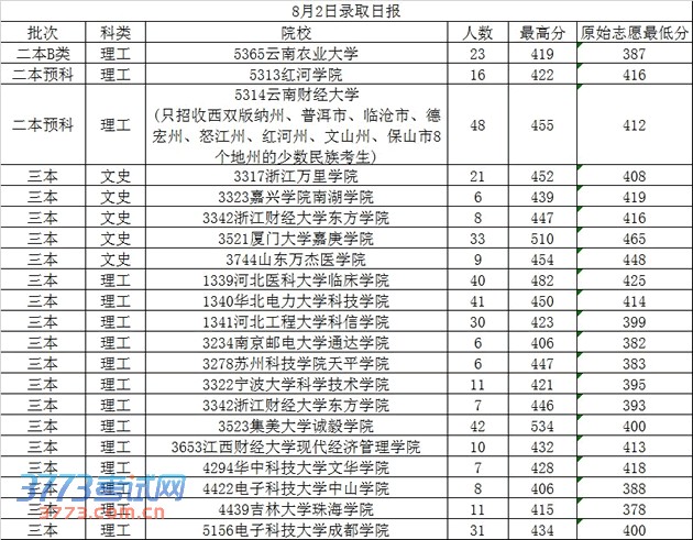 2013年8月2日云南高考录取分数线日报