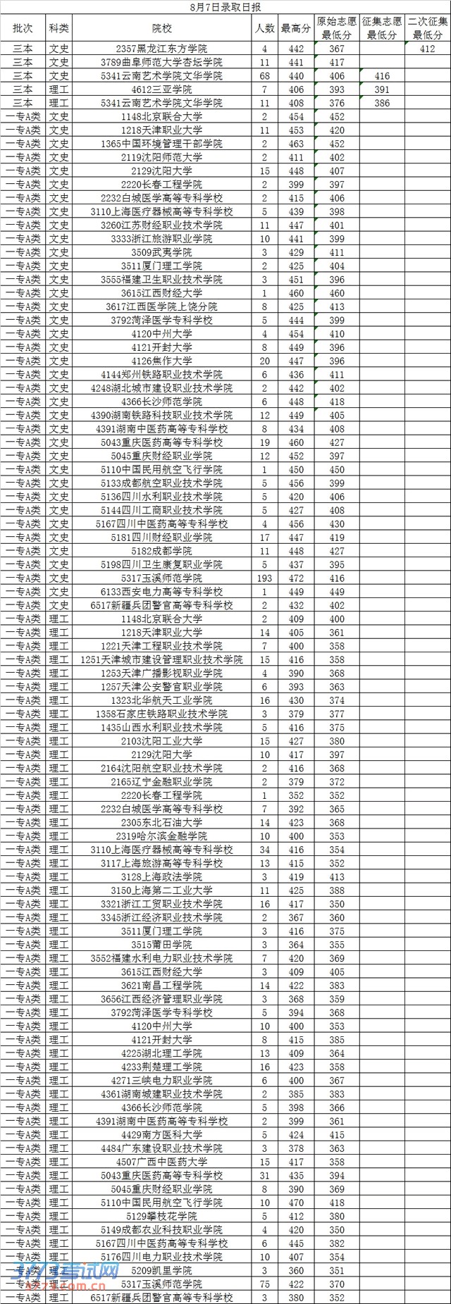 2013年8月7日云南高考录取分数线日报
