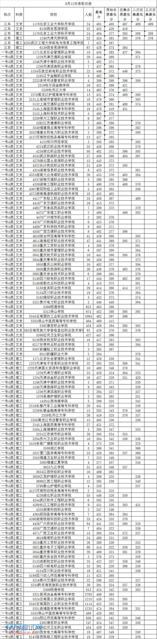 2013普高招生8月12日录取日报 2013年8月12日云南高考录取分数线日报