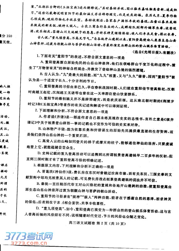 3.B(对“重阳登高由原生态山岳山神崇拜过渡为朝觐山神与菩萨的朝山活动”的原因理解错误,原文是“自各地开山建刹以来……”)