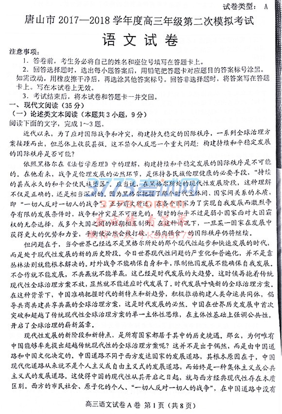 唐山市2017-2018学年度高三年级第二次模拟考试语文试卷