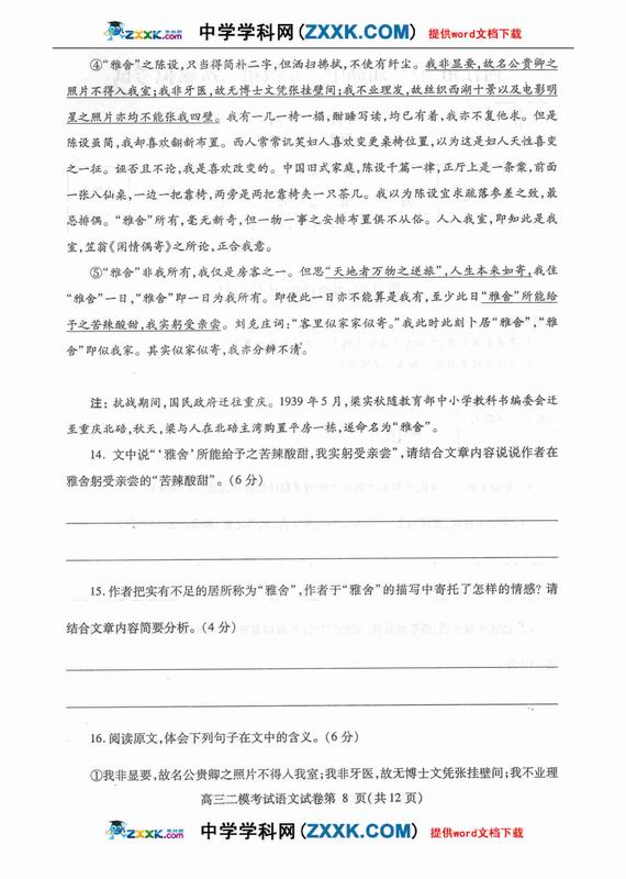 高三文化经典语文阅读模拟试题