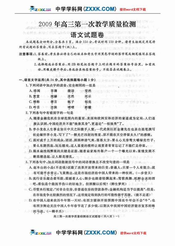 苏北四市09届高三第三次调研测试语文