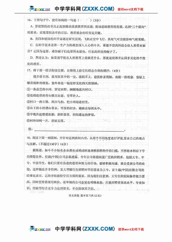 09海淀区高三期末考试真题及答案:语文