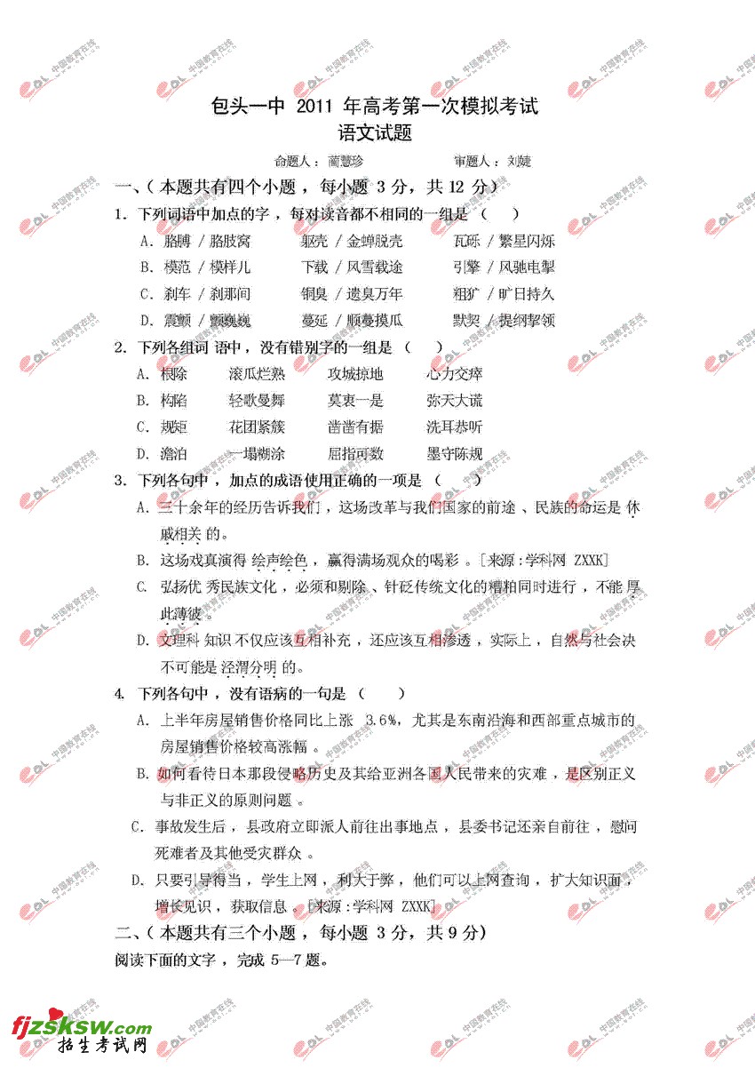 内蒙古包头一中2011年高考模拟考试试卷语文
