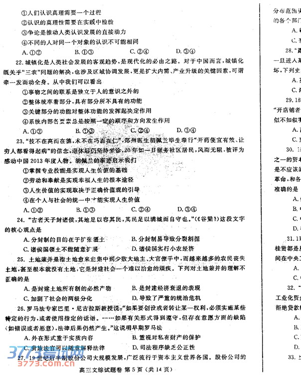 2014郑州二模文综试题及答案发布2014年高中毕业年级第二次质量预测地理 参考答案一、单项选择题(每题4分,共44分)1.C 2.D 3.D 4.C 5.D 6.D 7.A 8.C 9.B 10.D 11.D二、非选择题(共56分)36. (22分)(1)(8分)地势由西北向东南倾斜,(2分)地表干旱缺水,(2分)沙漠广布,(2分)植被稀疏(荒漠植被)。(2分)(2)(8分)西北风。(2分)冬春季节,亚欧大陆由于气温低,(2分)(垂直方向)空气盛行下沉运动,近地面形成高压中心,(2分)(近地面)空气从高压中心呈顺时针辐散,该地区位于高压中心的东南,故为西北风。(2分)(3)(6分)砂砖夜晚吸收露珠并保温,白天释放水汽,为沙丘上植被的生长提供了足够的水分和温度,有利于固沙植物的生长。(2分)同时,铺设砂砖可以增加地表粗糙程度,降低风速,(2分)拦截沙源,固阻流沙,(2分)阻止沙丘前移。37.(24分) (1)(8分)开采成本和风险大;(2分)冬季漫长而寒冷,(2分)冻土广布,(2分)开采困难;劳动力短缺。(2分)(2)(8分)由温带草原带(或温带荒漠带)(2分)向亚热带常绿阔叶林带(2分)变化。 由北向南,随着纬度和距海远近的变化,气候由温带大陆性气候(2分)向亚热带湿润气候(2分)变化(或热量和水分条件发生变化)。(3)(8分)提高加拿大作为美国供应国的地位,降低美国对中东石油的依赖,(2分)保障了美国的能源供应。(2分)降低炼油业和石油加工业等生产成本,(2分)带动美国炼油业和石油加工业的发展。(2分)42.(10分)旅游地理北半球的冬季,(2分)此时南极周围正值极昼。(2分)原因:经济发展水平提高,收入增加;科技的进步,信息多元化;求知探秘欲望的增加;交通工具的发展。(任答3点得6分)43.(10分)自然灾害与防治东北地区冻融作用强烈, 土层松脆;河流发育,山麓冲积扇洪积物较多,为泥石流发育提供了物质基础。多低山丘陵,地势起伏大;春汛致使山坡下滑、坍塌;降雨集中, 且强度大(多暴雨);河网密布,汇流速度较快,易形成洪水。(任答5点得10分)44.(10分)环境保护变化:生活用水和环境用水的比重增加,(2分)工农业用水比重下降。(2分)措施:节约用水;(2分)提高灌溉技术,提高水资源利用率;(2分)跨流域调水。(2分)2014年高中毕业年级第二次质量预测政治 参考答案一、选择题(每小题4分,共48分)12.A 13.B 14. D 15.C 16.D 17.C 18.D 19. C 20. B 21. A 22.B 23.C二、非选择题(共52分)38.(26分)(1)问题:我国钢铁产业集中度低(企业数量多,规模偏小);技术设备整体水平较低;粗钢产量大,高附加值产品依赖进口,产品结构不合理;近年来,我国钢铁业产能过剩,利用率下降。(每点2分,回答以上任意三点即可给6分)建议:支持优势钢铁企业开展兼并重组,提高产业集中度;(2分)利用财政税收优惠政策,引导钢铁企业进行技术改造和产品结构升级;(2分)强化环保、能耗、技术等标准,规范市场准入,淘汰落后产能;(2分)提供咨询与服务,鼓励钢铁企业加快“走出去”的步伐。(2分)(2)人大代表:积极调研,听取相关方面的意见和建议,形成提案;(3分)就钢铁行业的发展对相关部门进行质询、监督(或:审议各项议案、表决各项决定,支持钢铁行业发展)。(3分)政府:加强经济调节(2分)和市场监管;(2分)转变职能,提升服务能力和水平。(2分)39.(26分)(1)观点一:赞同引进引进国外文化产品可以满足人民群众当下多样的文化需求;(2分)有利于繁荣文化市场,给企业带来经济效益;(3分)尊重了世界文化的多样性,有利于促进不同民族文化之间的交融;(3分)中华文化具有包容性,对待外来文化应求同存异、兼收并蓄。(2分)观点二:赞同原创坚持原创,提高原创能力,才能从根本上满足人民群众的文化需求;(2分)可以提升文化软实力、国际影响力,增强文化自觉和文化自信;(3分)中华文化具有独特性,坚持原创有利于保持中华文化的民族特色;(3分)加强原创有利于传承、弘扬中华文化,维护文化安全。(2分)(2)任何事物都包含着矛盾,文化产品的数量与质量是对立统一的。(3分)我国文化产品生产既要注重数量,丰富文化市场;又要注重质量,提高文化品位和内涵。(3分)坚持具体问题具体分析。正确处理文化产品数量与质量的关系是解决现阶段我国文化产品发展问题的关键。(3分)坚持“两点论”和“重点论”相统一。文化产品生产要把质量放在第一位,实现质量和数量的统一。(3分)(3)坚持主流价值观;题材选择多样化;实事求是,尊重历史;立足实践,挖掘现实题材,等。(回答以上任意两点即可给4分,其他答案言之有理也可酌情给分)2014年高中毕业年级第二次质量预测历史 参考答案24—28 CBABA 29—33 DBCCB 34—35 BA40.(1)主要观点:“理”是万物的本源;“理”是构成万事万物的本体存在;人世间的伦理纲常是“理”的具体化。(一点2分,共6分)影响:有利于社会的和谐稳定;(2分)理学建立的理想人格的理论与观念,对于中华民族注重气节、注重道德、注重社会责任和历史使命的文化性格产生了深远影响。(3分)(2)主要观点:人是世界的主体,人所生活的世界离不开人的主观感受。(2分)时代价值:修补了理学僵化所造成的问题,推动了儒学的发展;充分肯定人的主体意识和主观能动性,成为晚明人文思潮的哲学基础。(一点2分,共4分)(3)相同点:都属于唯心主义世界观;都主张维护封建伦理制度。(一点2分,共4分)不同点:理学强调“理”是世界的本源,属于客观唯心主义思想,心学强调人的主体感受是万物的本源,属于主观唯心主义;理学否定人的主观能动性,心学重视人的主观能动性。(一点2分,共4分)41.示例一