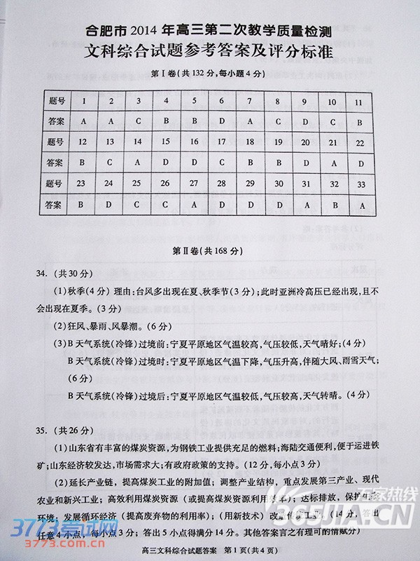 2014合肥二模文综试题及答案评分标准